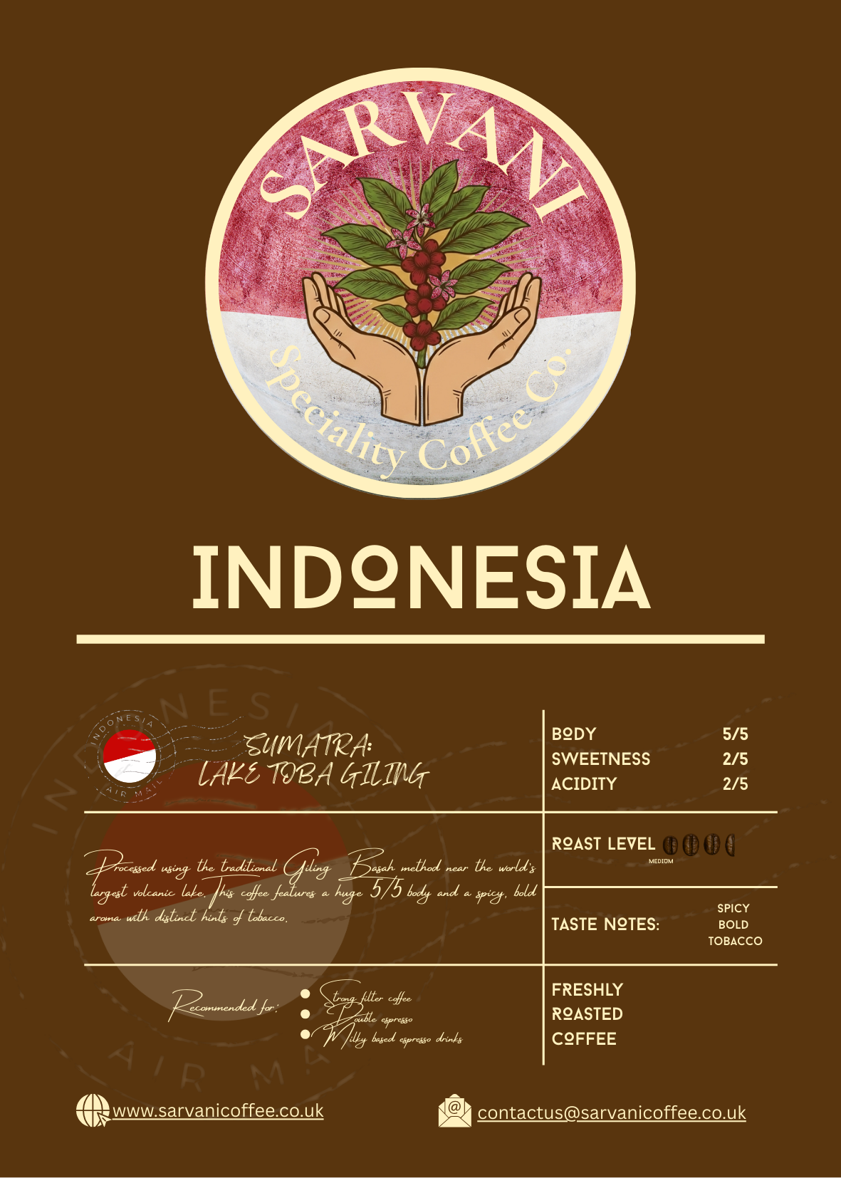 Processed using the traditional Giling Basah method near the world’s largest volcanic lake. This coffee features a huge 5/5 body and a spicy, bold aroma with distinct hints of tobacco.