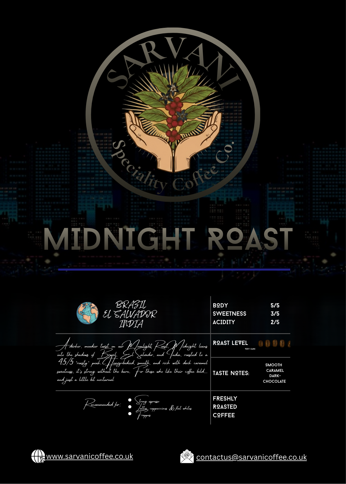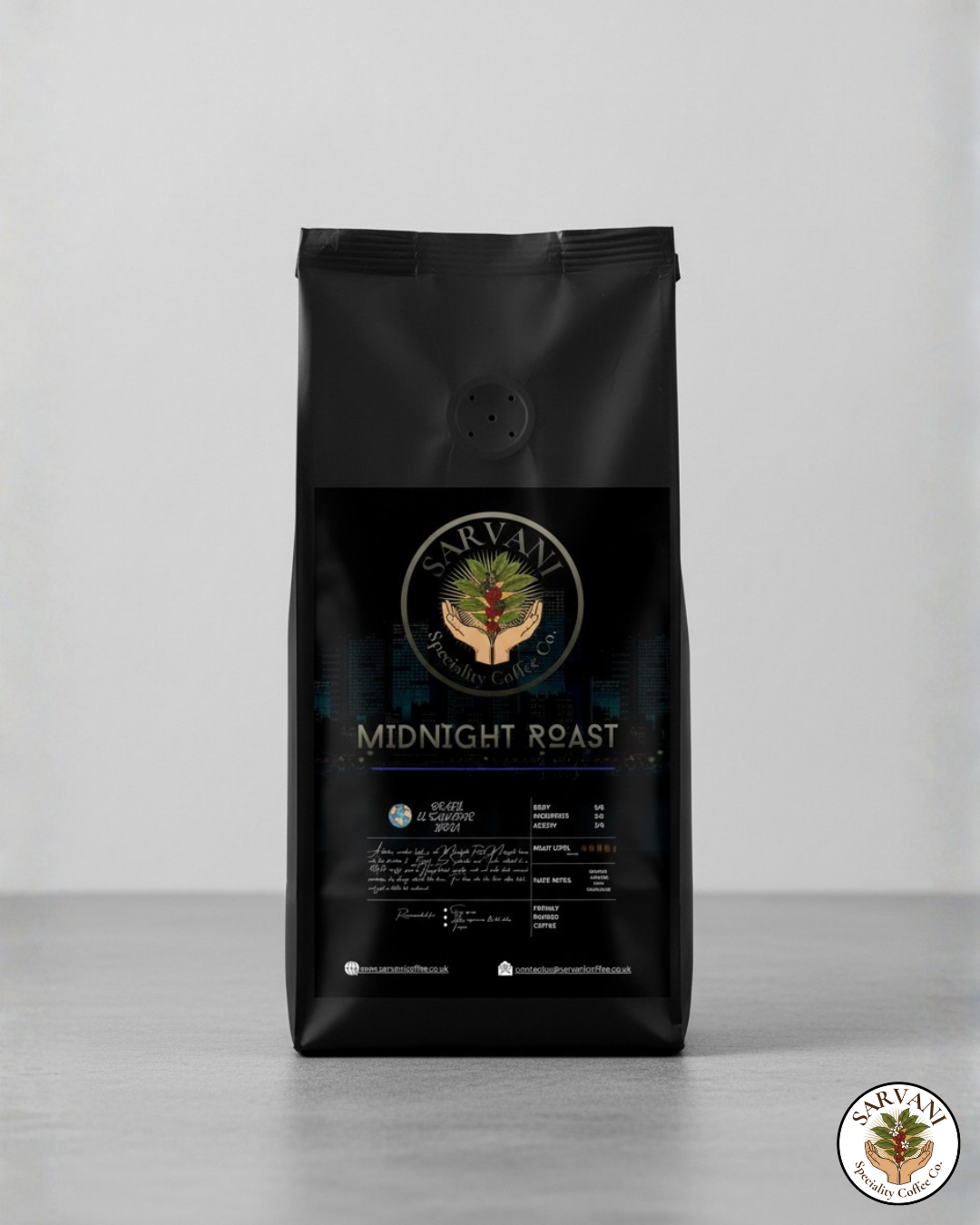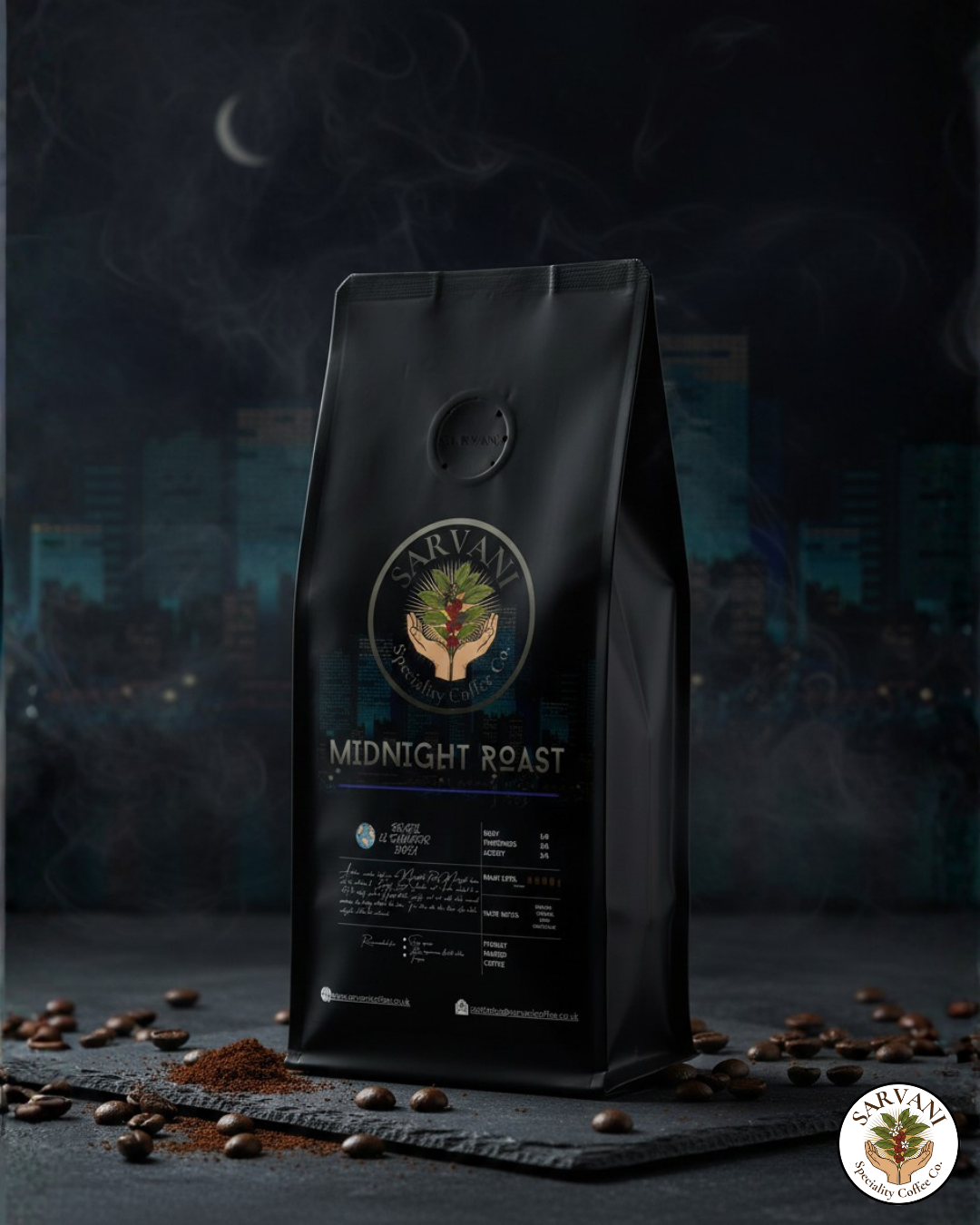 A darker, moodier twist on our Moonlight Roast, Midnight leans into the shadows of Brazil, El Salvador, and India, roasted to a 4.5/5 “roasty” peak. Heavy‑bodied, smooth, and rich with dark caramel sweetness, it’s strong without the burn. For those who like their coffee bold… and just a little bit nocturnal
