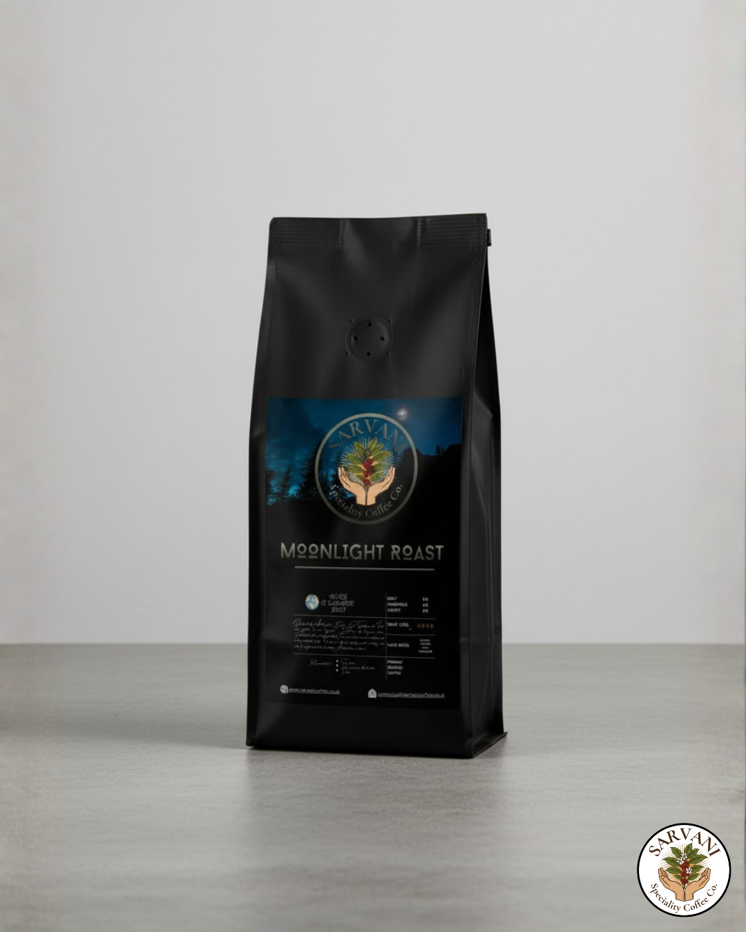 Hand‑picked Arabica from Brazil, El Salvador, and India come together in our Signature Blend—a true Sarvani classic. Full‑bodied with a velvety mouthfeel, it carries natural caramel sweetness and a deep chocolate finish. In milk, it turns irresistibly smooth, revealing rich notes of nougat and dark chocolate. A masterclass in balance.