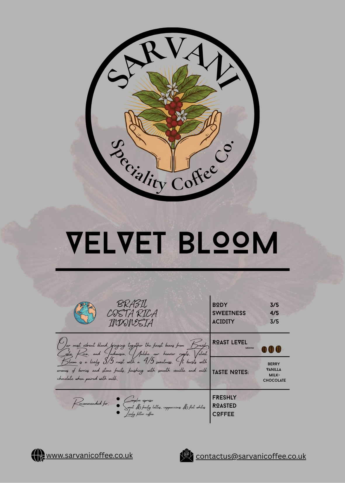 Our most vibrant blend, bringing together the finest beans from Brazil, Costa Rica, and Indonesia. Unlike our heavier roasts, Velvet Bloom is a lively 3/5 roast with a 4/5 sweetness. It bursts with aromas of berries and stone fruits, finishing with smooth vanilla and milk chocolate when paired with milk.